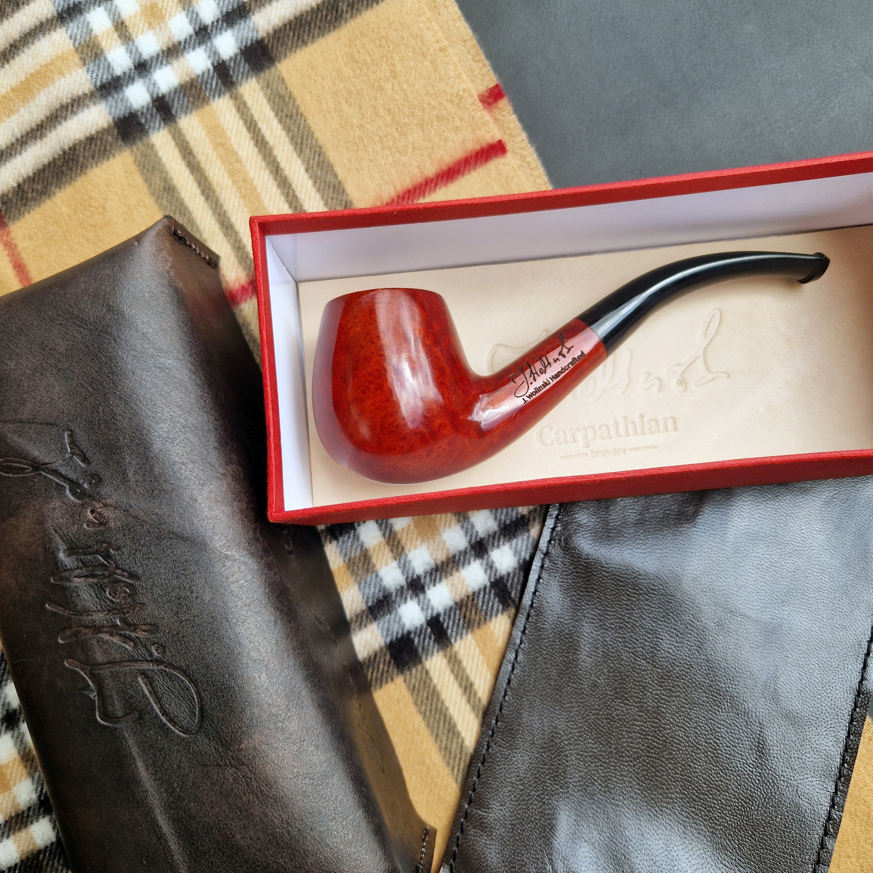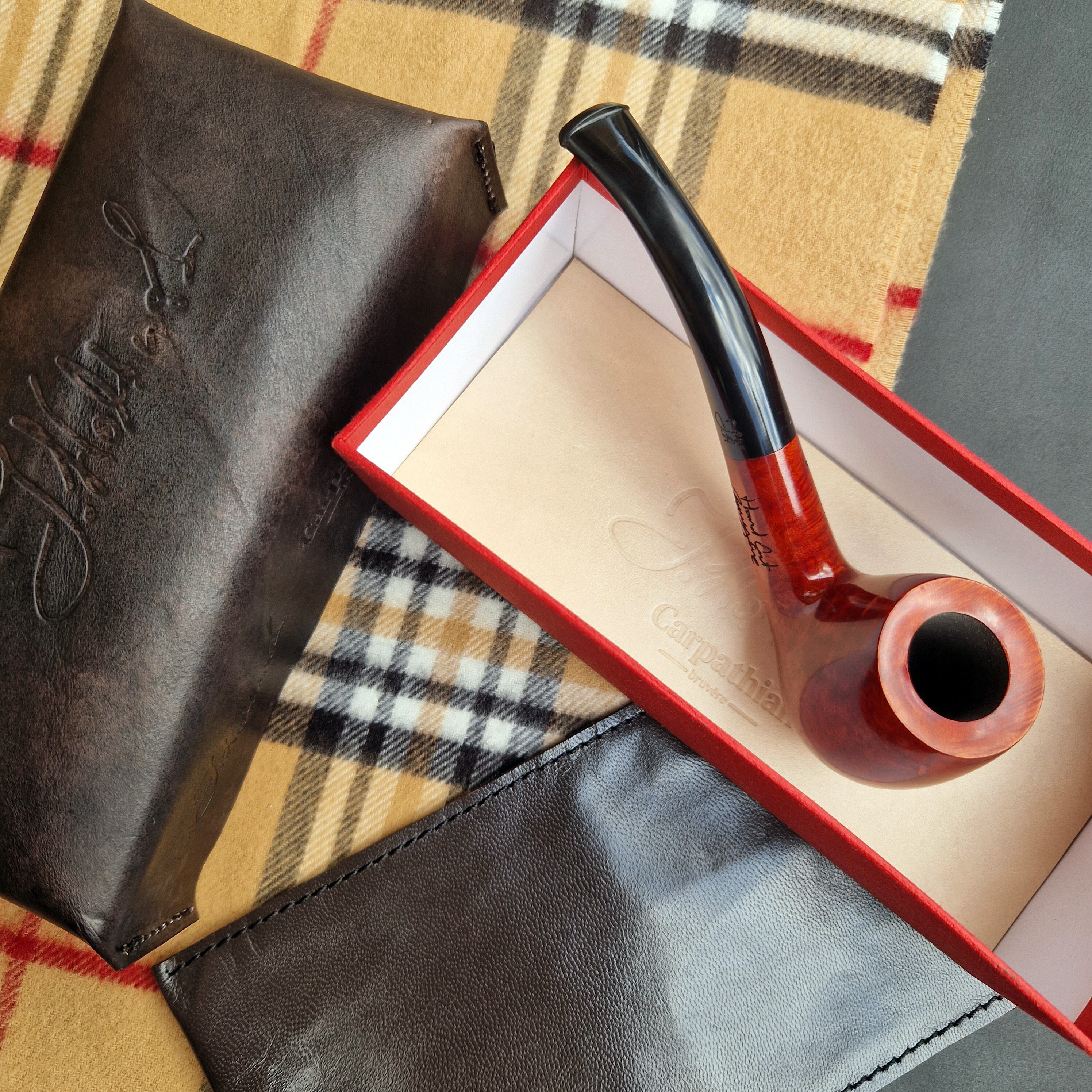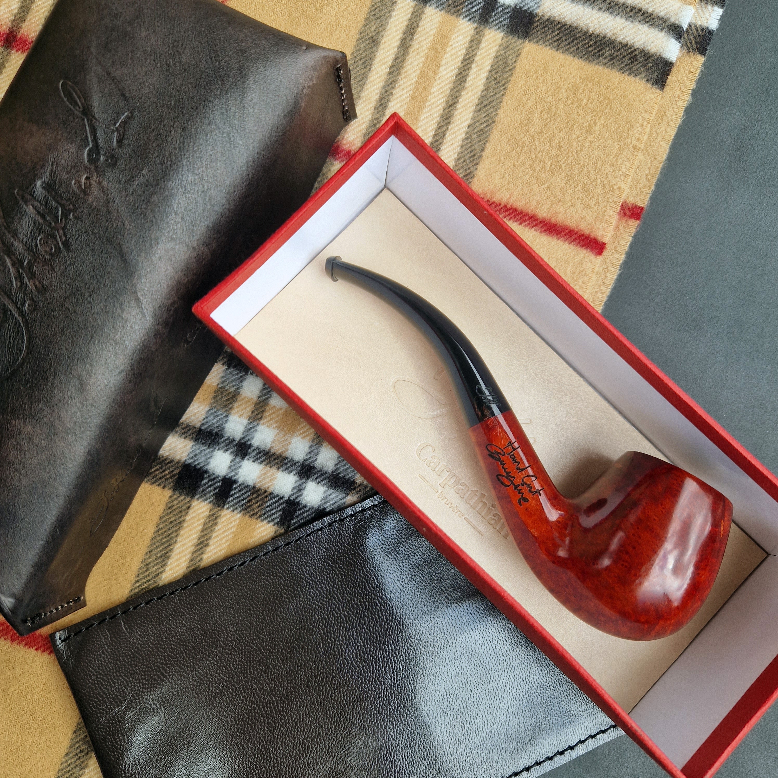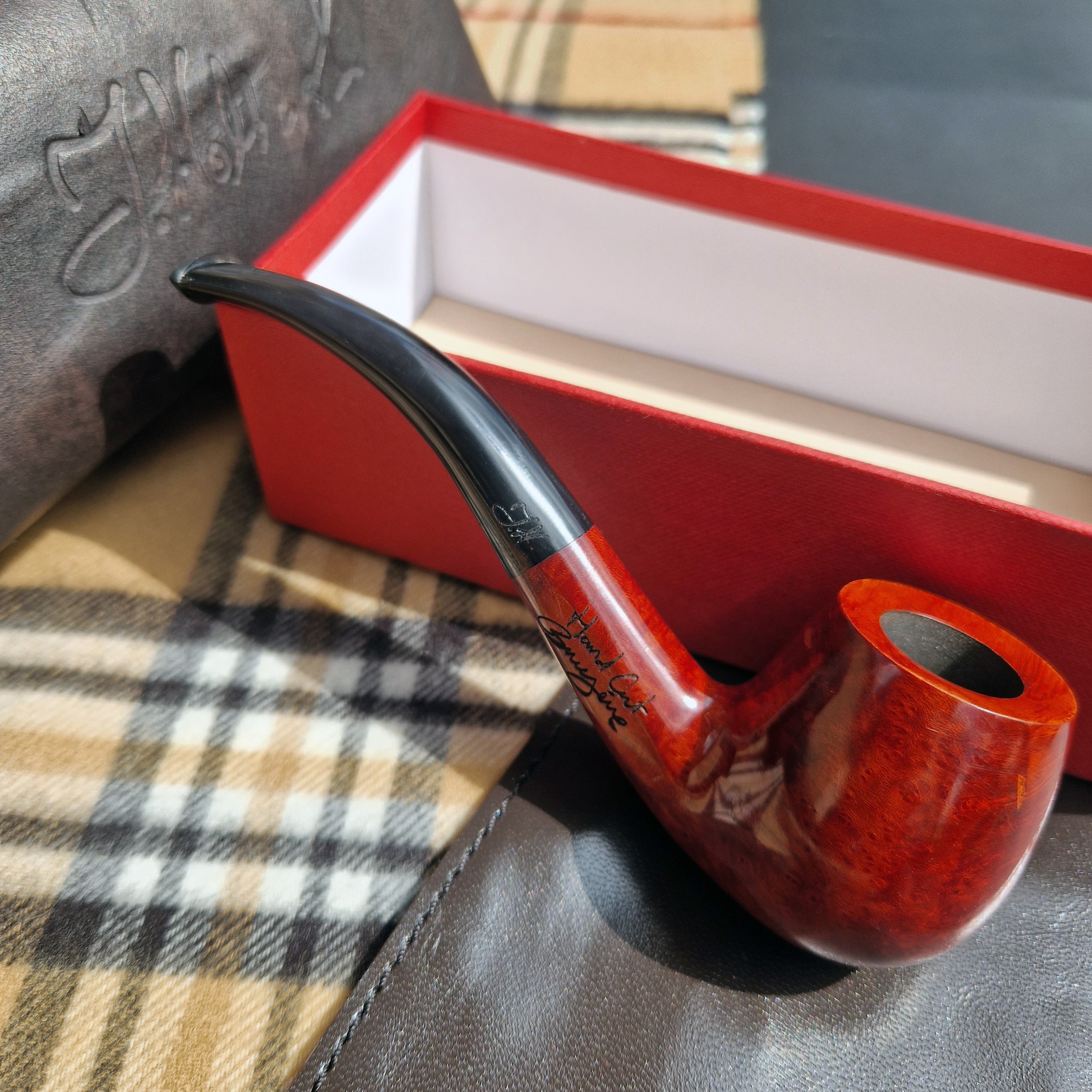 Comes securely packaged in a premium quality box with a genuine leather lid for moisture protection and a full-grain leather pouch to protect the pipe.